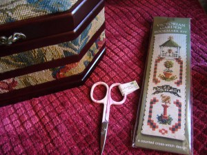 Los reyes magos se han acordado de mi colección de tijeras y me han dejado unas preciosas de color rosa además de un nuevo costurero y un kit para bordar un punto de libro de Victorian Garden .