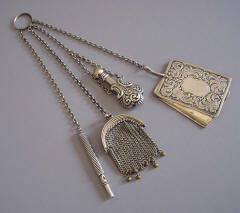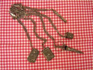 Las chatelaines de  costura tenían dedal, tijeras, alfilitero, cinta métrica y punzón