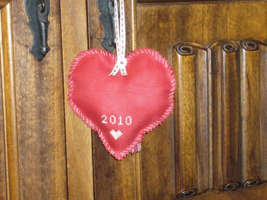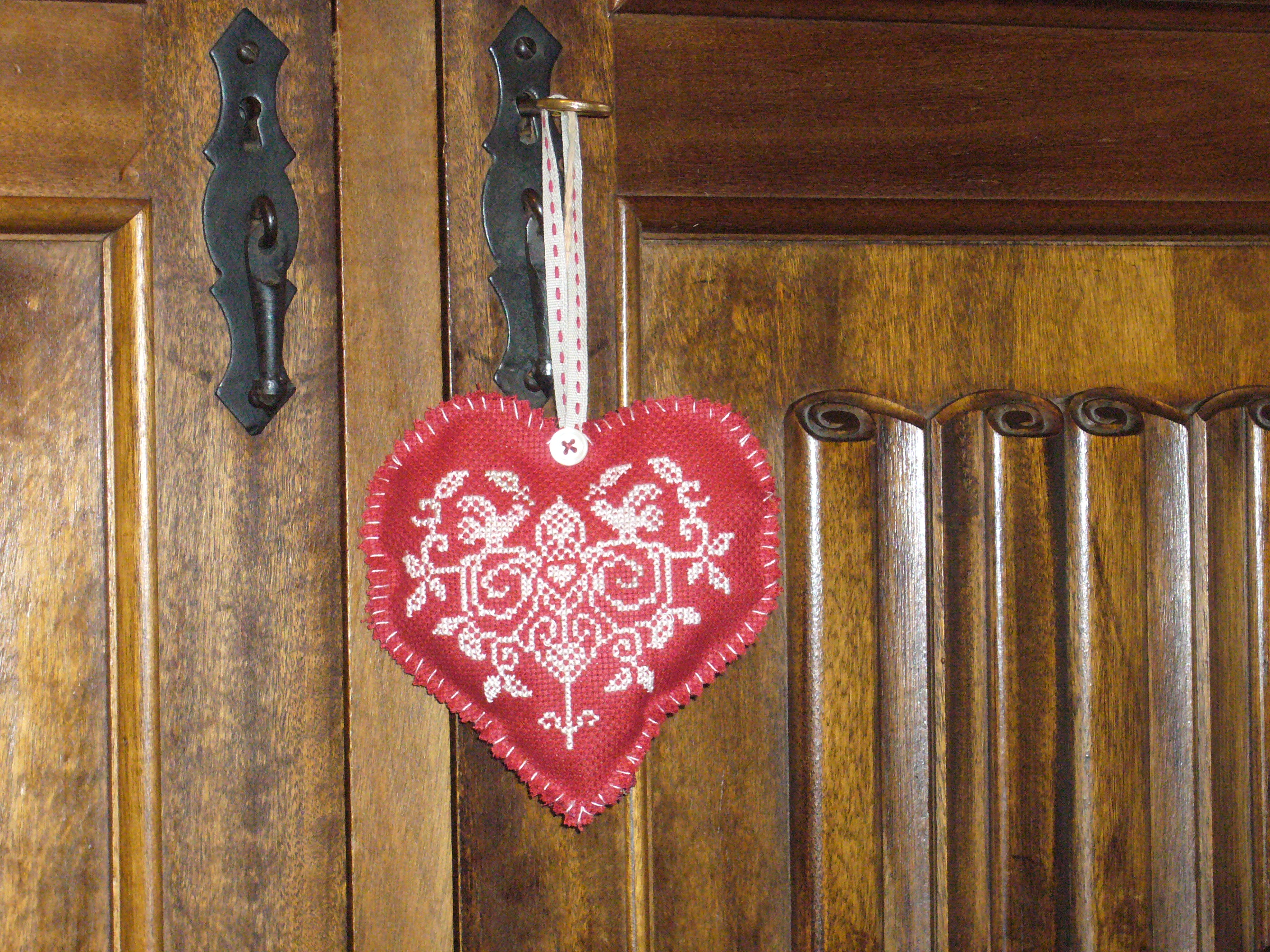 He bordado este corazón con hilo DMC 275 en una tela Aida de color rojo y  lo he rellenado con popurri de Santa Maria de la Novella que huele de maravilla.