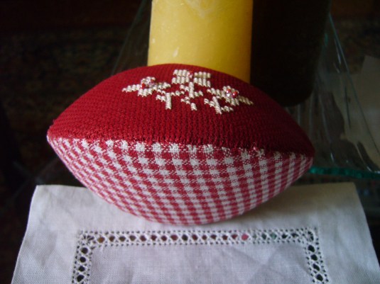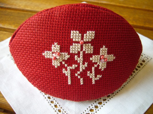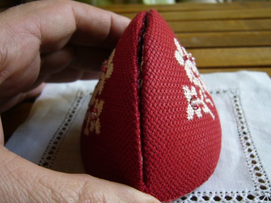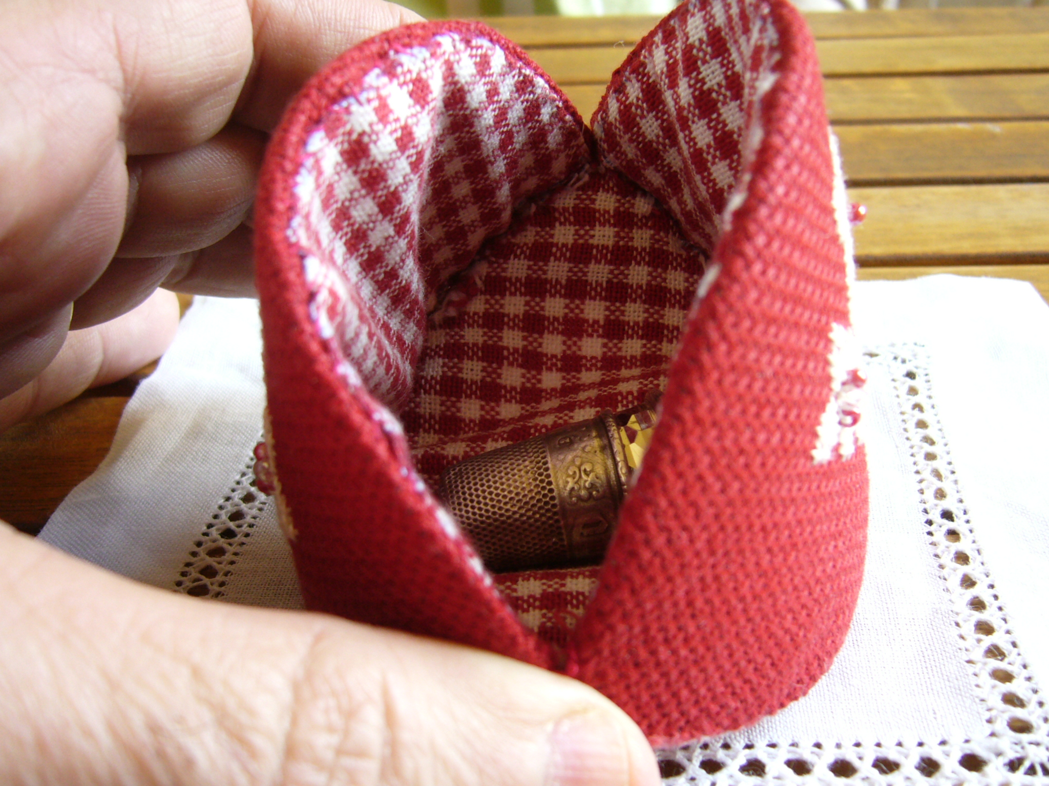 He decorado un dedalero con el gráfico de este nuevo desafío de Kirsten . He usado tela Aida de color rojo y lo he bordado por los dos lados con hilo DMC crudo y rematado con abalorios a juego. Para la base y la parte interior he usado una tela vichy en blanco y rojo.
