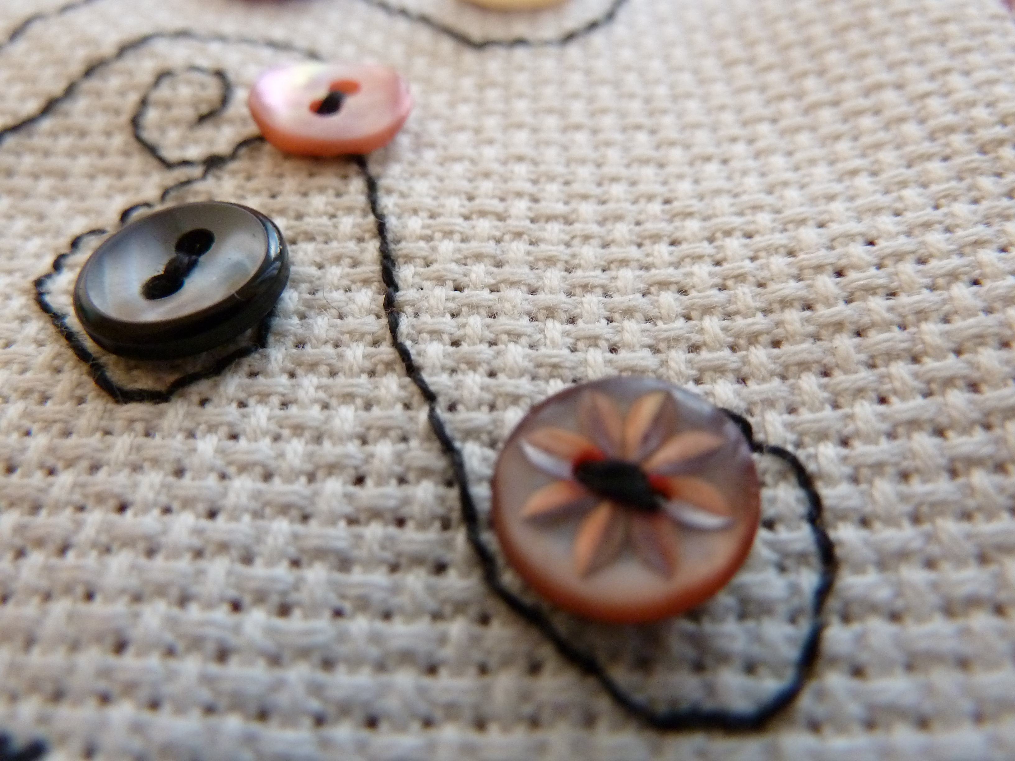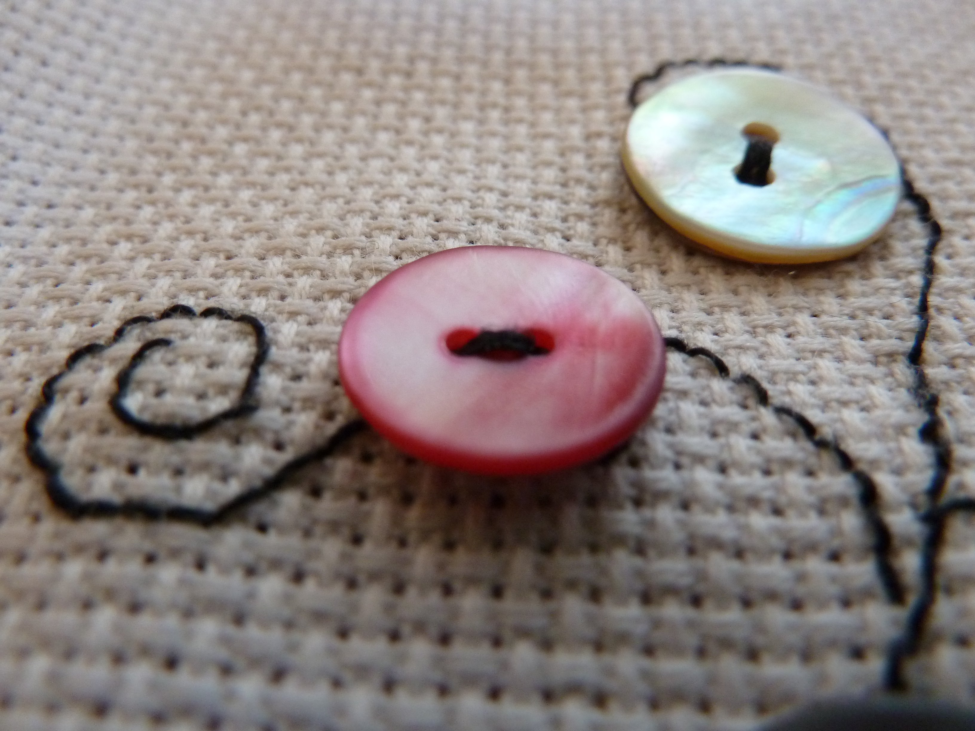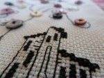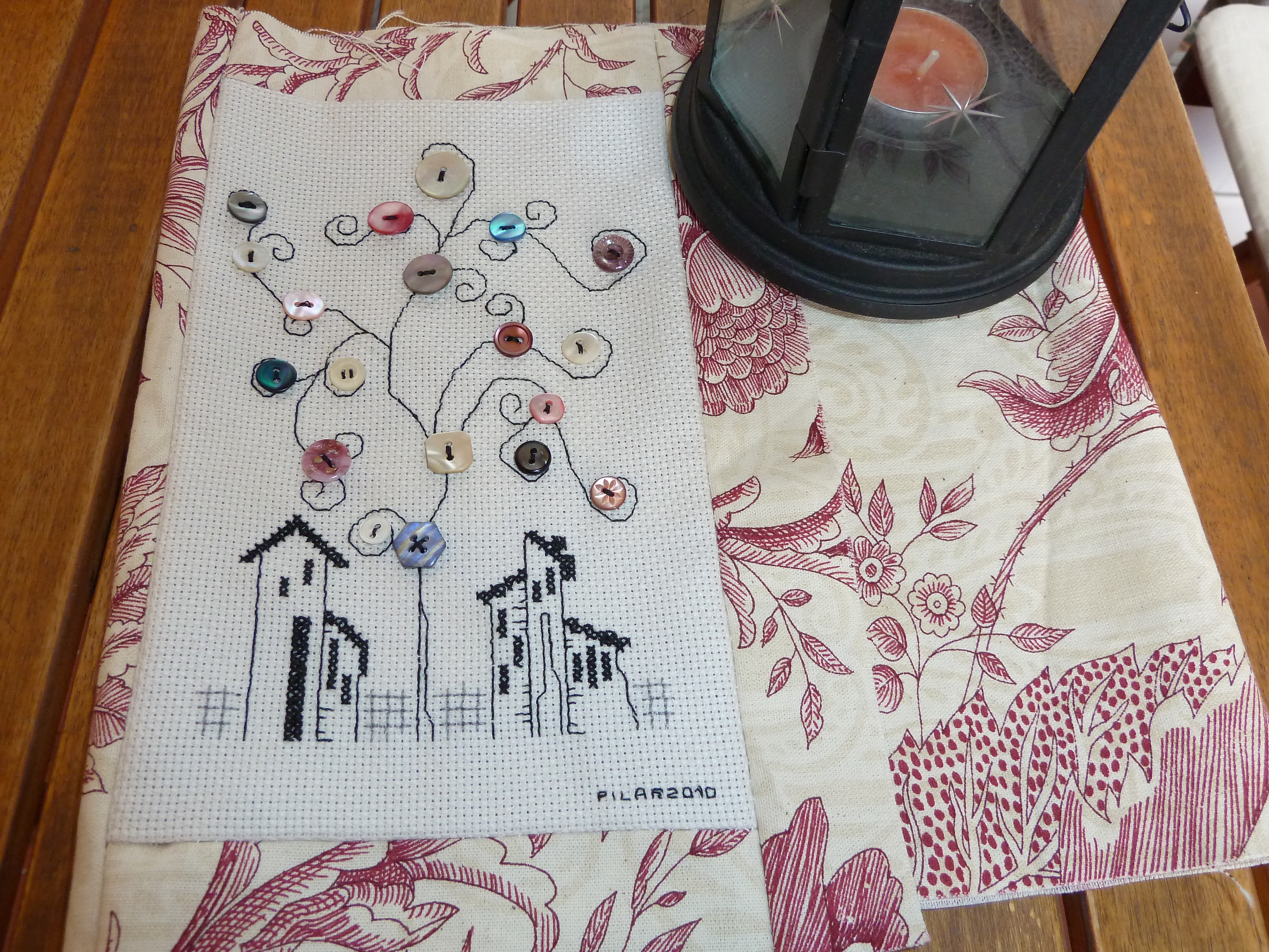 En este objetivo tenemos que bordar la minivilla (la tan deseada minivilla) que ha diseñado Raquel para  el neddle keeper. Como veis es una preciosidad bordada , en mi caso, en DMC 310 . Para la decoración he usado botones de nácar antiguos de diferentes formas y colores y botones de cristal de Murano. Me he divertido como una niña pequeña eligiendo los colores y la posición de los botones ¡Gracias Raquel!.