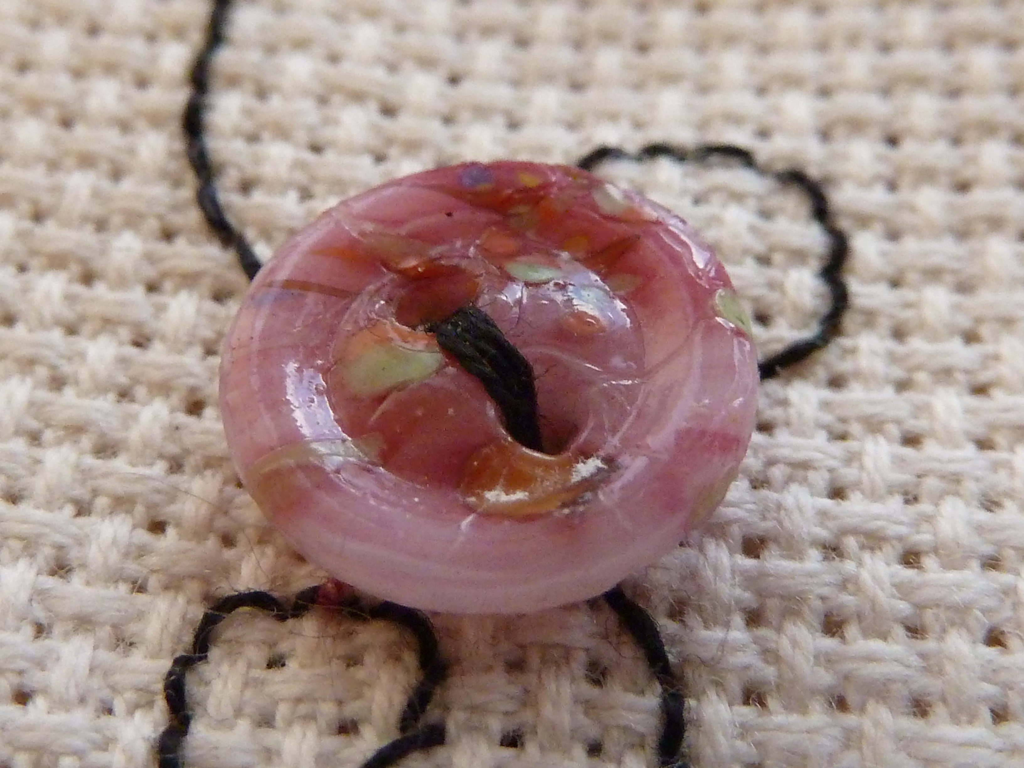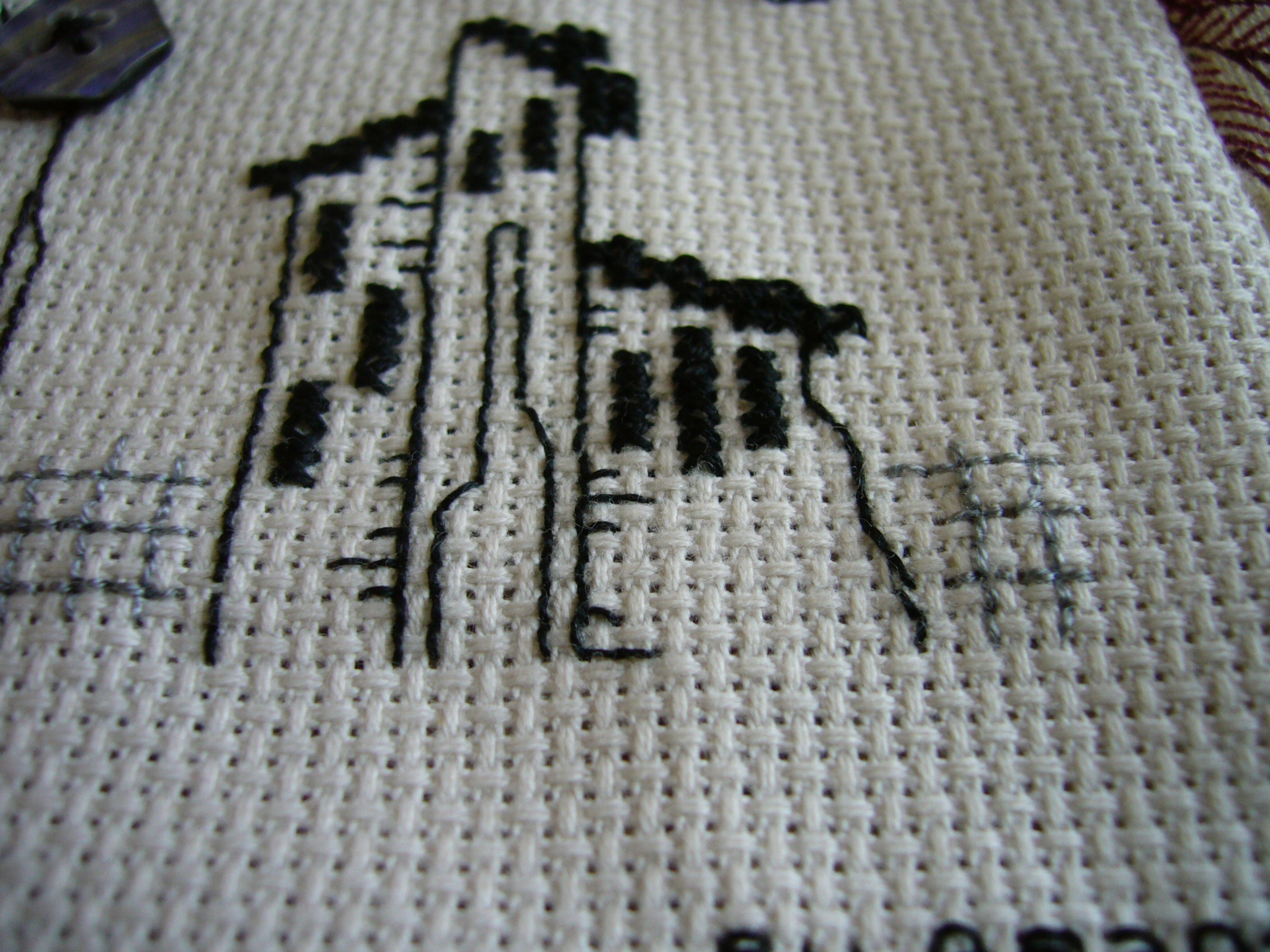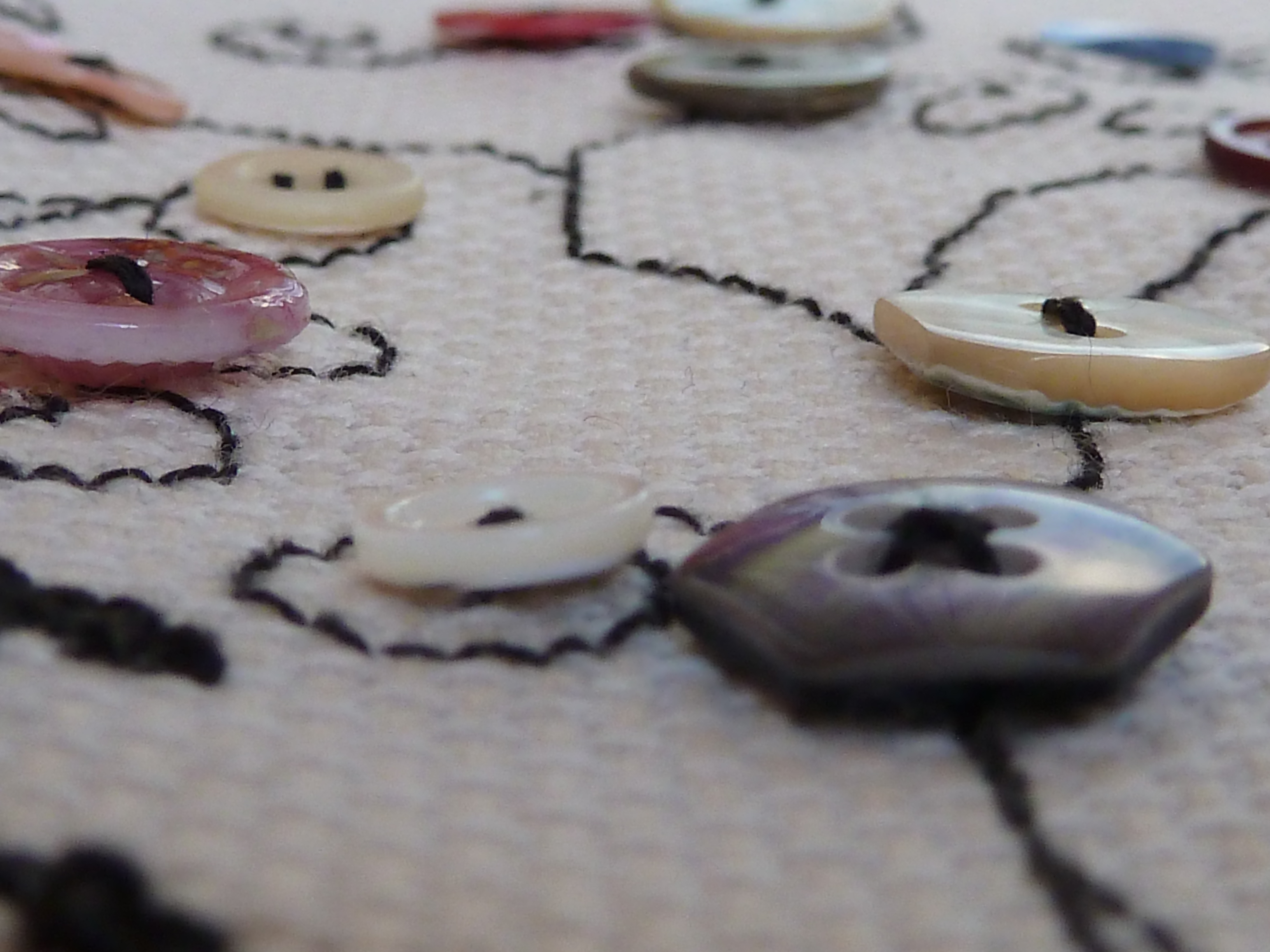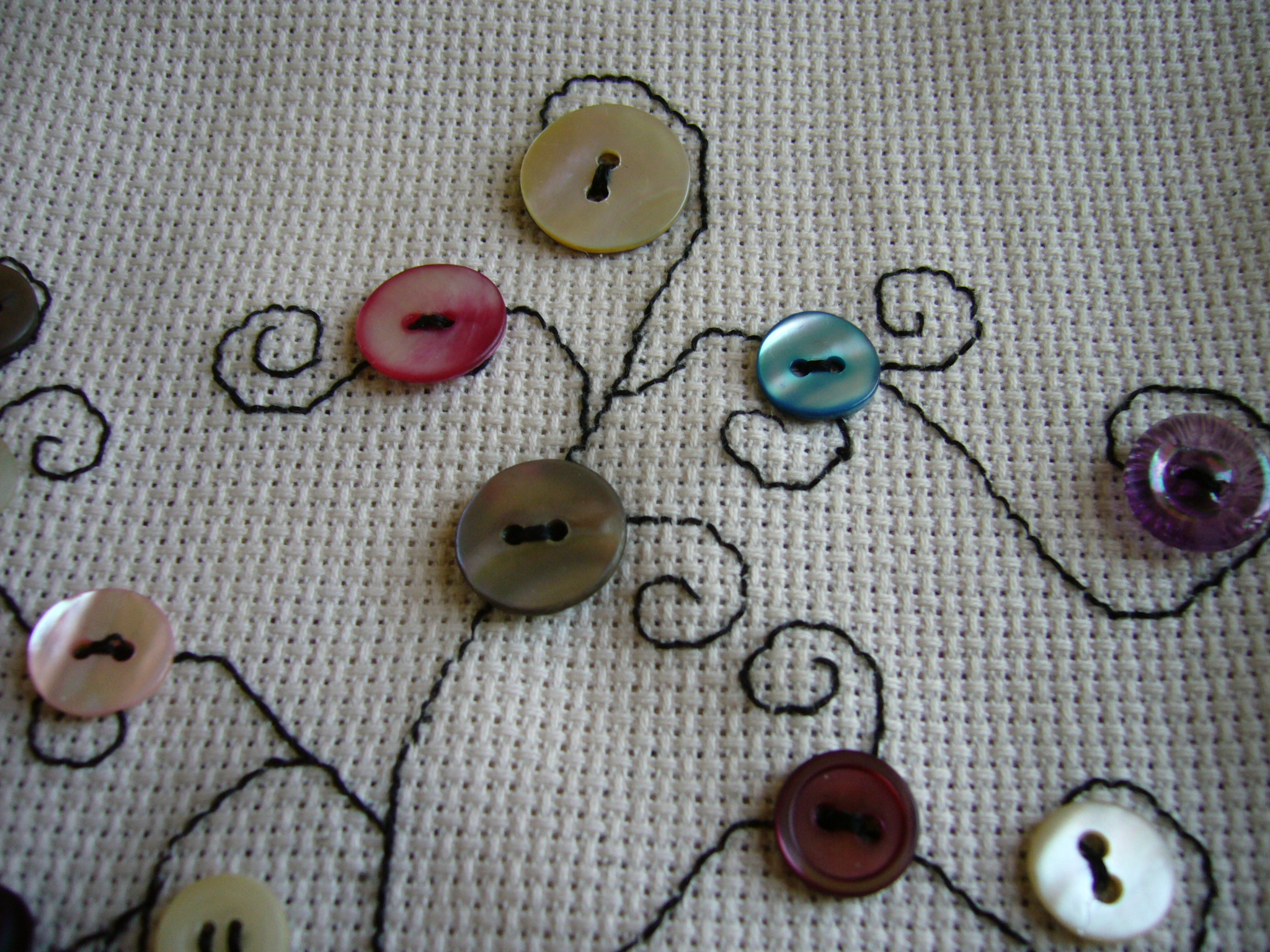 En este objetivo tenemos que bordar la minivilla (la tan deseada minivilla) que ha diseñado Raquel para  el neddle keeper. Como veis es una preciosidad bordada , en mi caso, en DMC 310 . Para la decoración he usado botones de nácar antiguos de diferentes formas y colores y botones de cristal de Murano. Me he divertido como una niña pequeña eligiendo los colores y la posición de los botones ¡Gracias Raquel!.