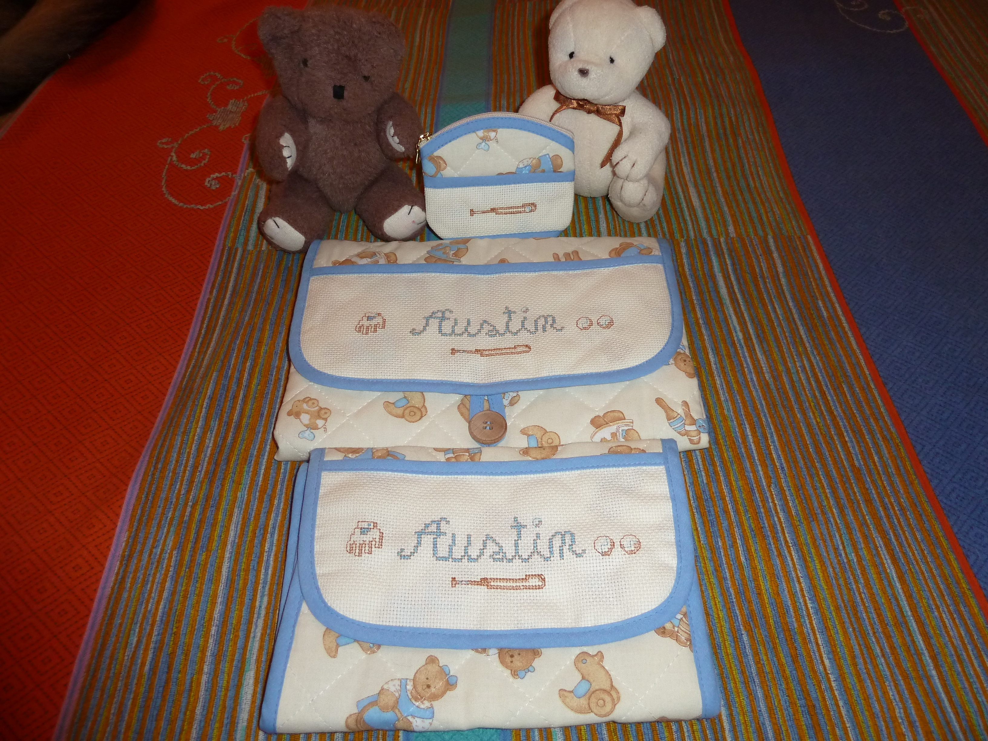 He bordado su nombre con motivos de béisbol en un cambiador, una bolsa para pañales y en una bolsa para el chupete. ¡Ya está camino de Estados Unidos!