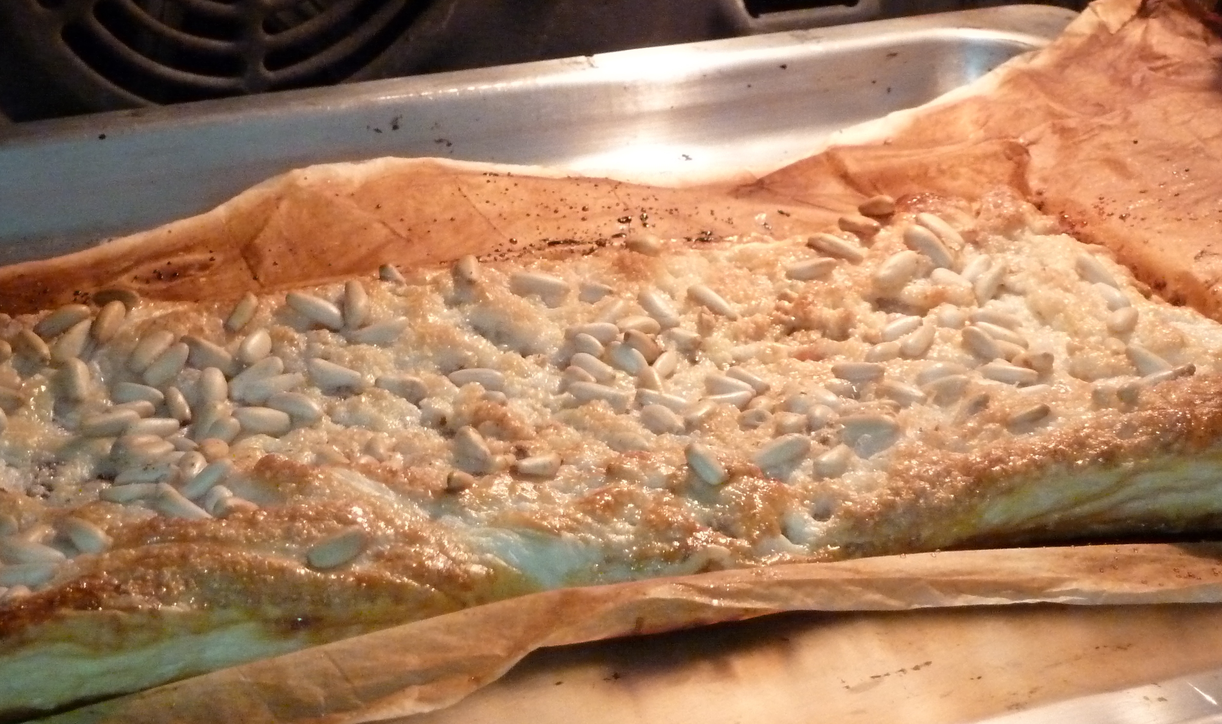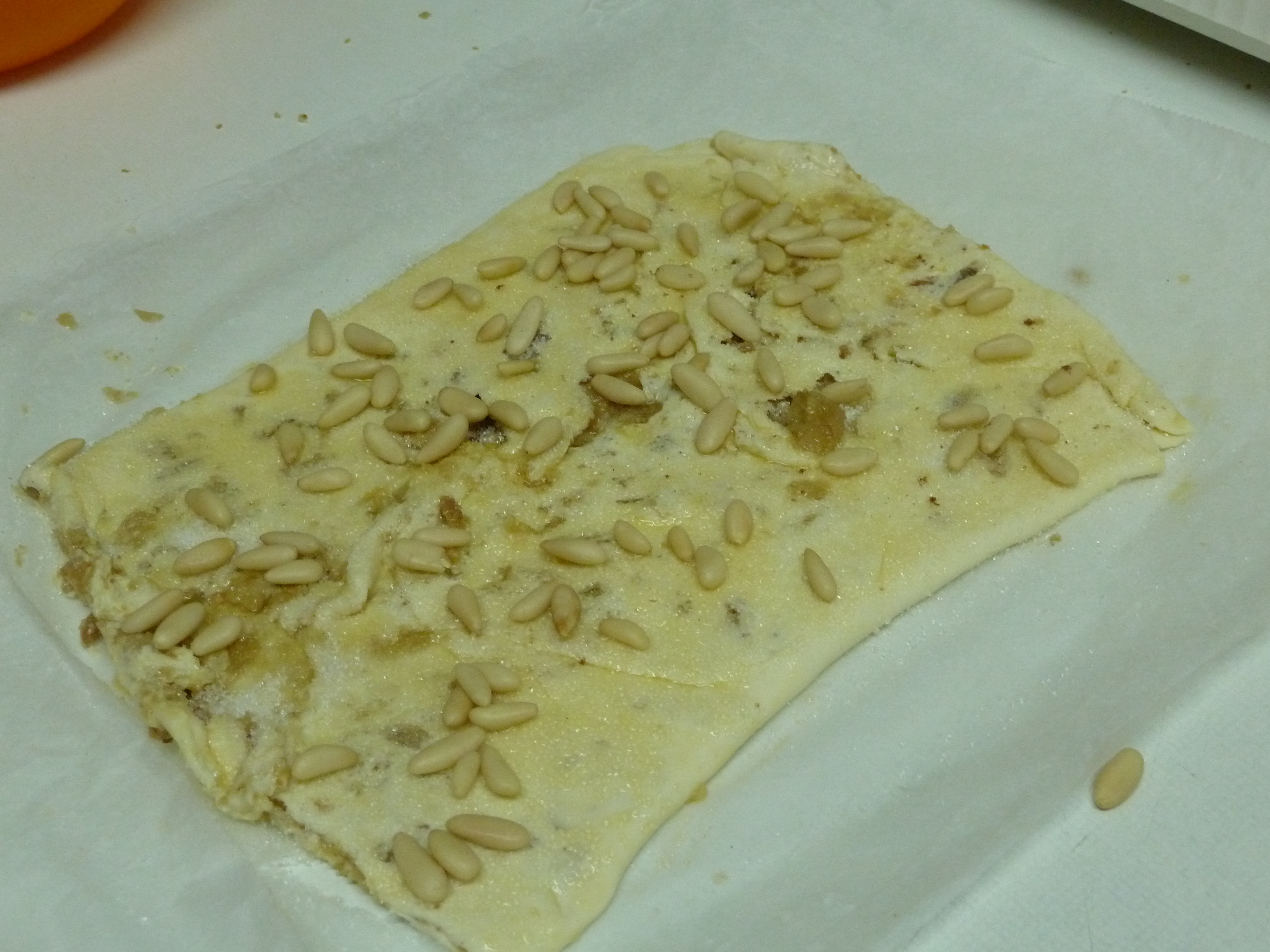 Pintar la coca con huevo batido y cubrir con piñones y azúcar.