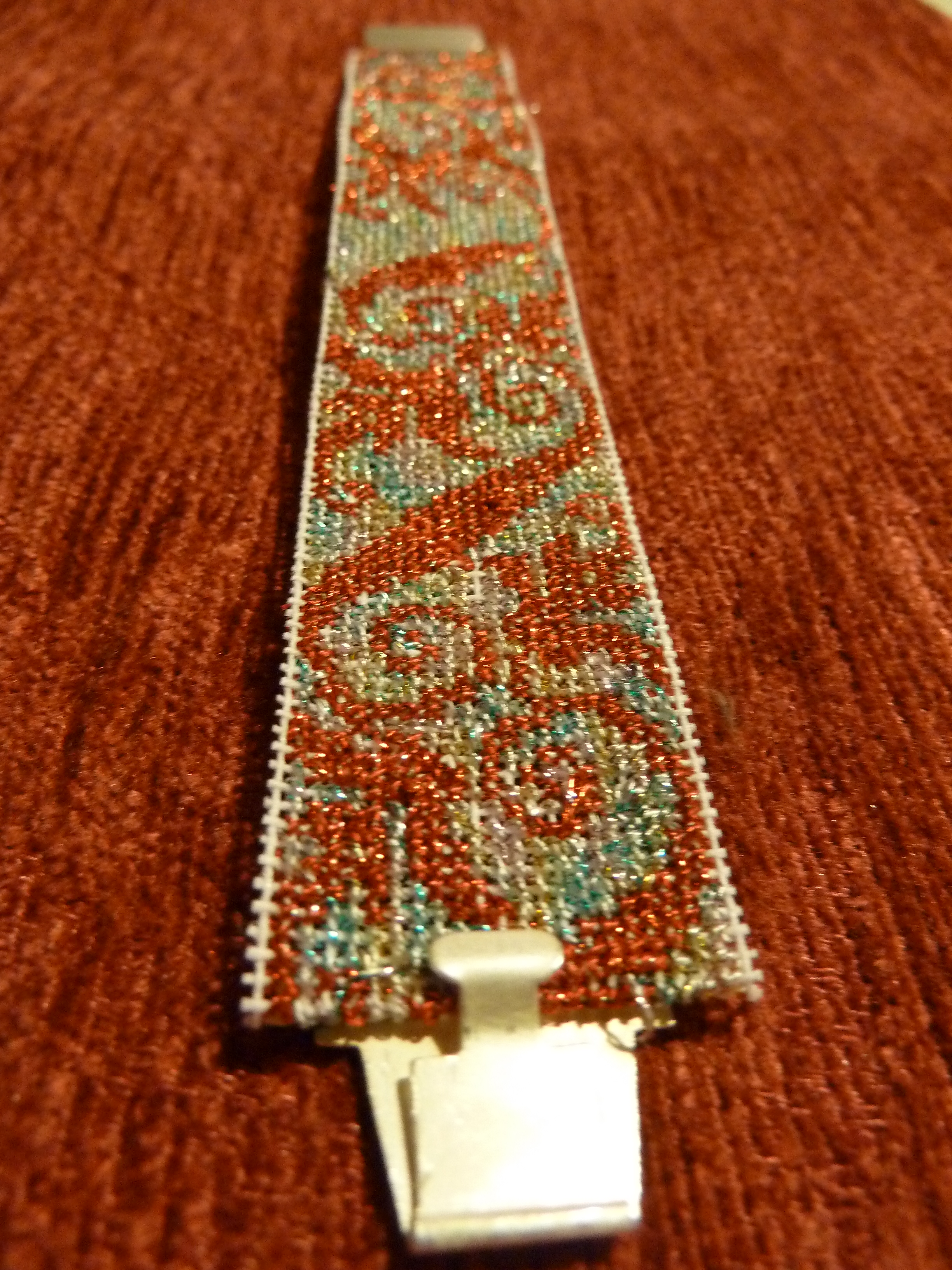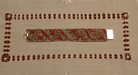 Para este nuevo reto-concurso que organiza Laura relacionado con los accesorios y complementos de vestir , he realizado esta pulsera bordada a punto de cruz y a medio punto con hilos metalizados Finca 421 y 444 (en las fotos no se aprecia mucho el brillo de los hilos). Espero que guste.
