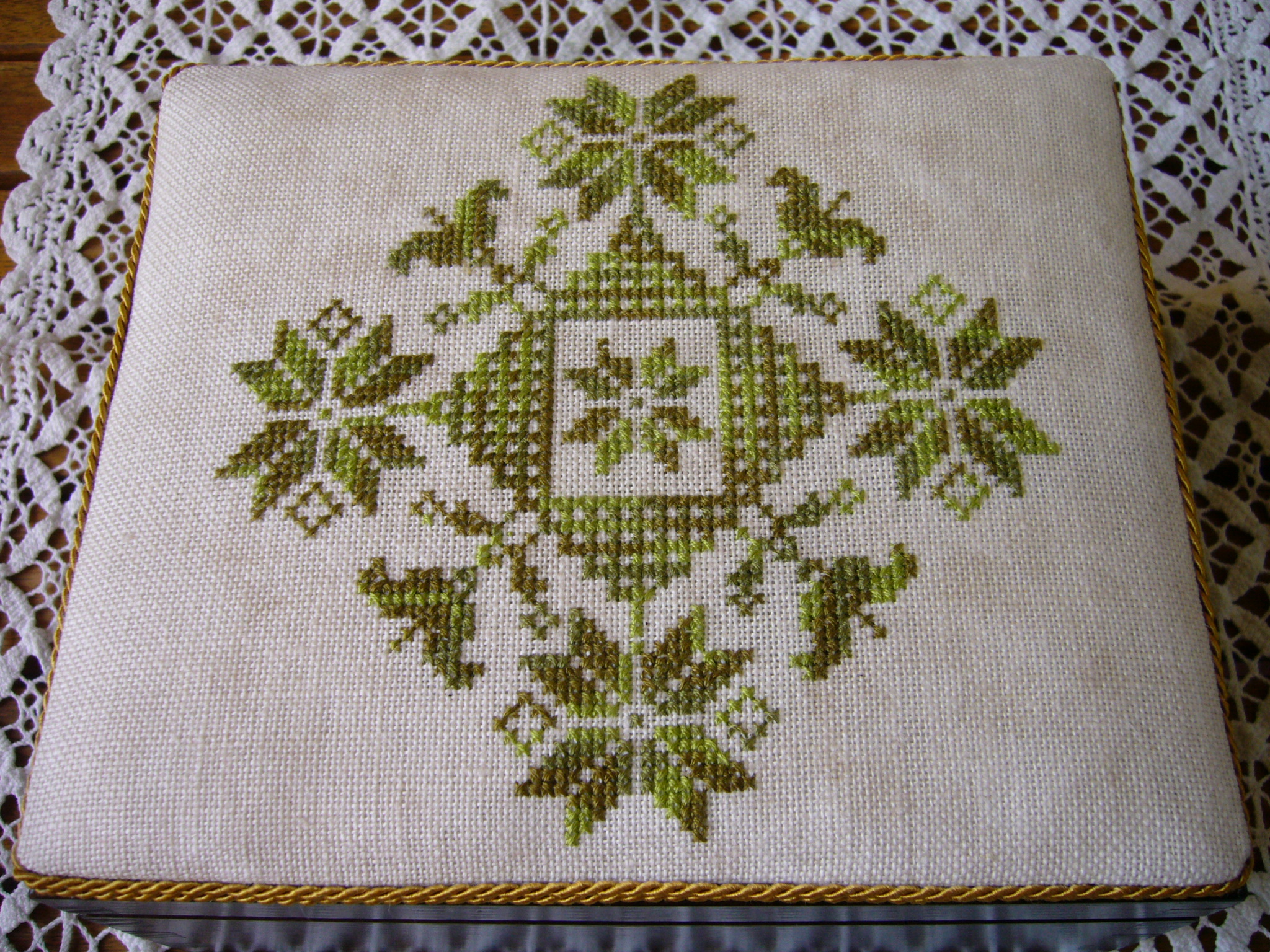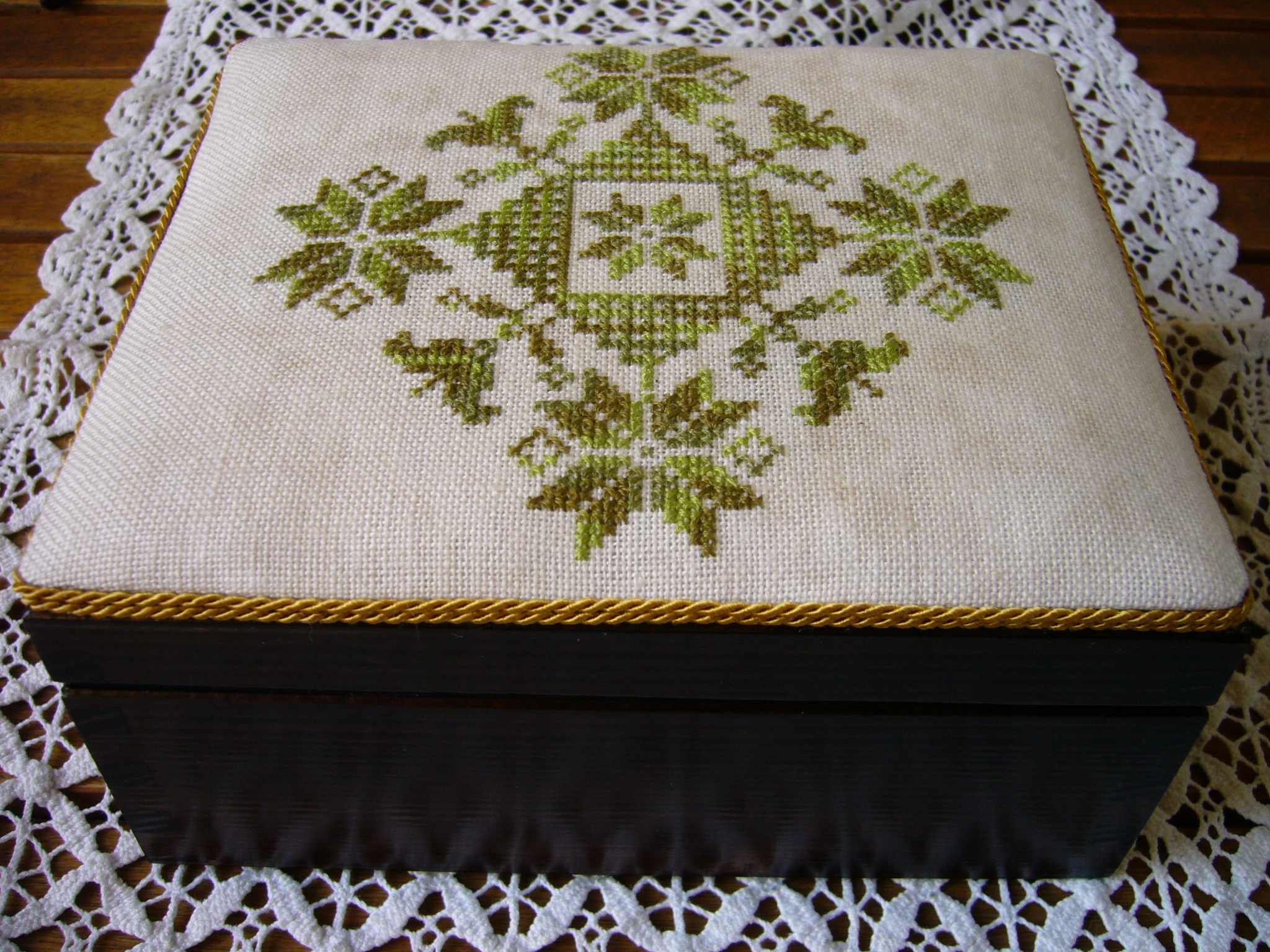 He decorado esta caja de madera con el gráfico que ha propuesto Kirsten en su nuevo reto. Para ello, he teñido el lino con café y lo he bordado con hilo Cosmo nº4.  Cómo remate final he colocado un doble cordón dorado a su alrededor.