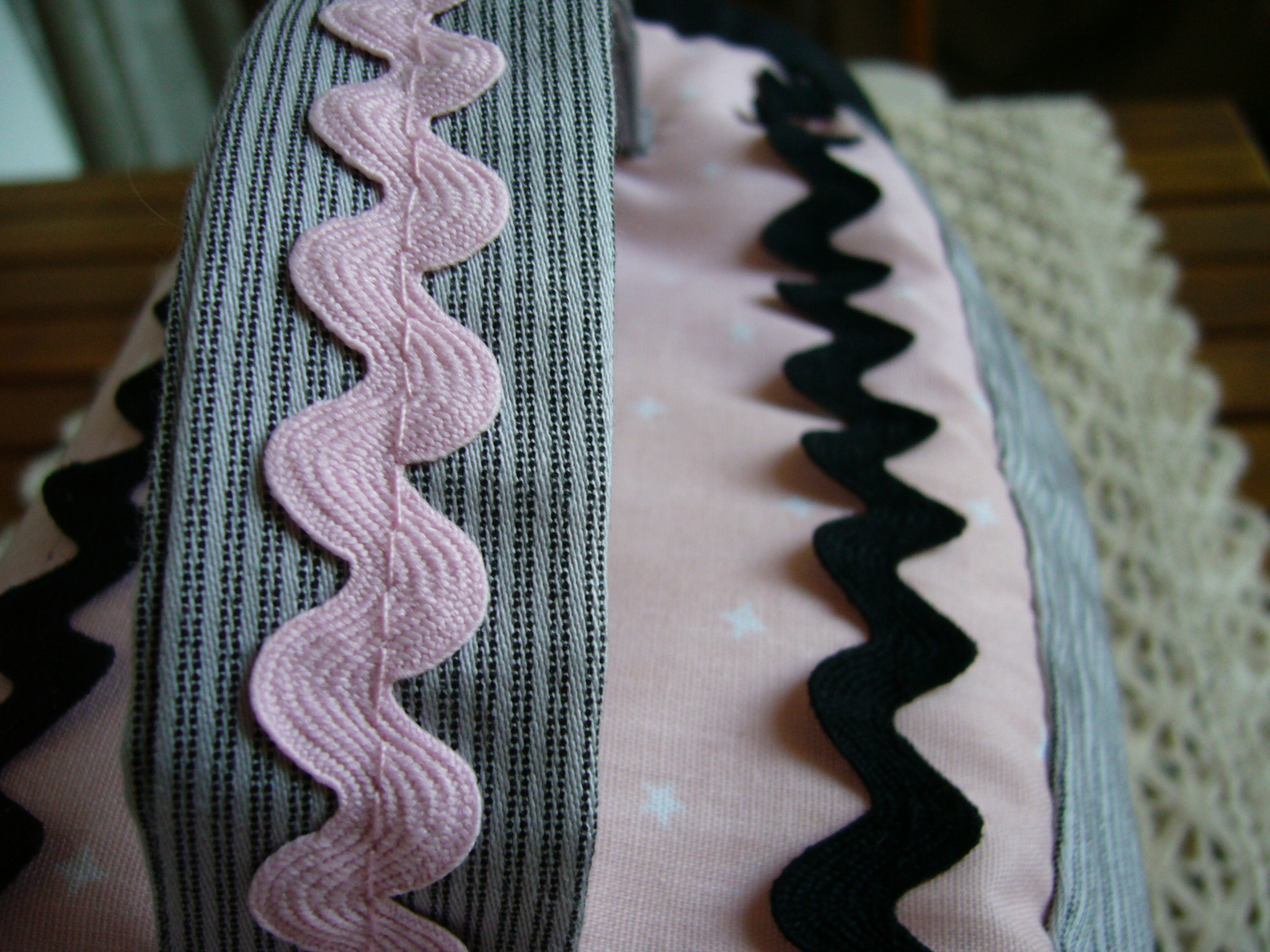 He combinado una tela de rayas en color gris con una de tela de color rosa estampada con pequeñas estrellas blancas. Como adornos he usado: ondulinas en color rosa y negro y en el bordado botones de fantasía. Y como detalle «fashion» en la cremallera he puesto un charm.