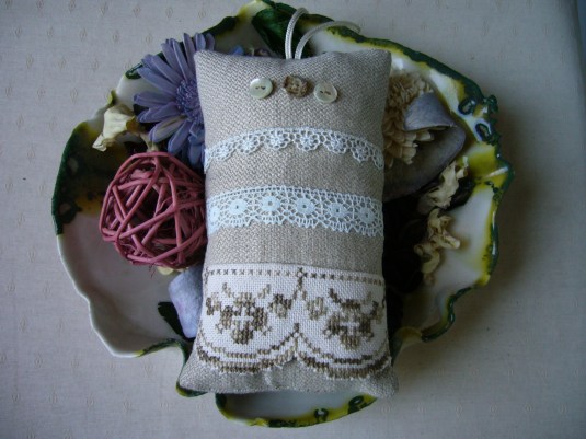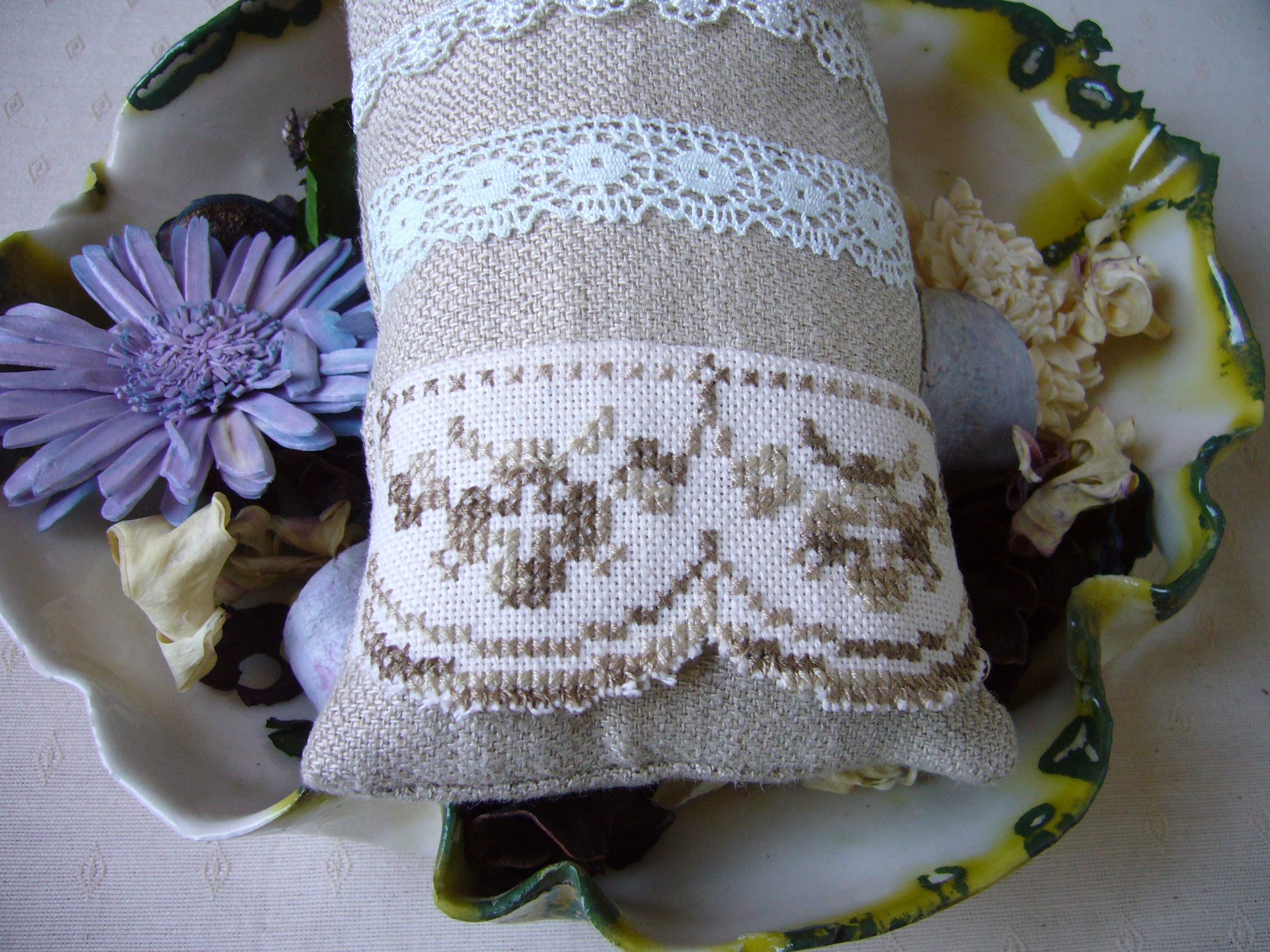 El nuevo reto de Kirsten ha sido el  gráfico de una puntilla.  He realizado el bordado en lino con hilo Cosmo marblethread y el resultado final ha sido un pequeño cojín hecho con  tela rústica  y decorado con puntillas.