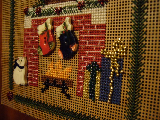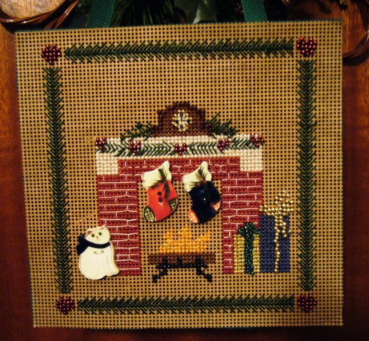 Estoy pisando el acelerador para  terminar labores pendientes del año pasado y poder empezar este nuevo año sin muchos UFOs, pero no se si lo conseguiré. De momento he terminado este adorno navideño que dejé por acabar otros que eran más urgentes; me lo regaló Dorothy en un intercambio que hicimos hace tiempo. Es un kit de la firma Mill Hill y se llama The stockings were hung.