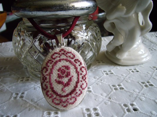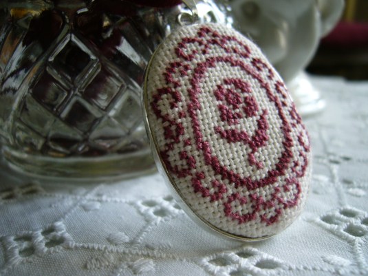 Es de plata y he podido hacer un diseño de Aurelle bordado en lino 1×1 con hilo DMC 99