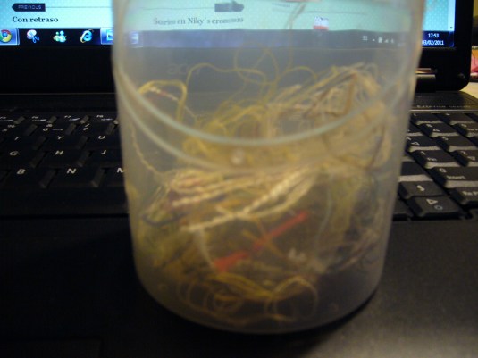 Como esta noche hay luna nueva he de mostrar para el TUSAL de It´s Daffycat cómo se va llenando mi recipiente con los recortes de hilos .