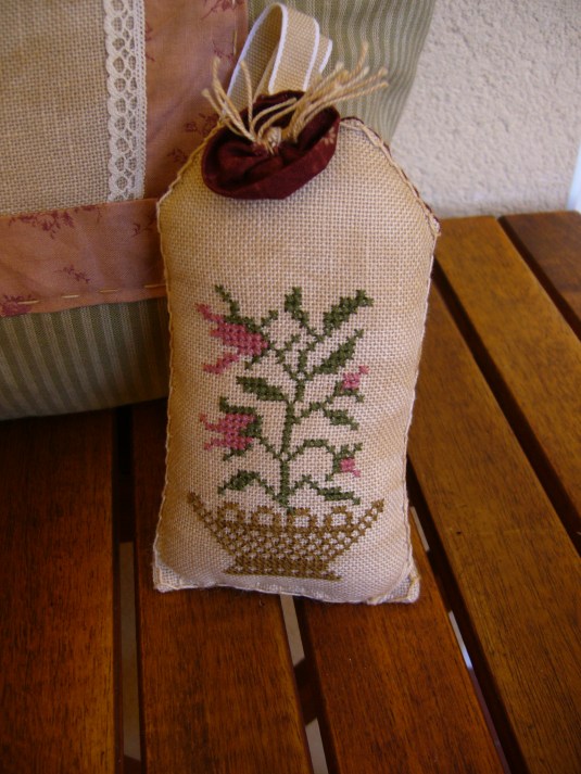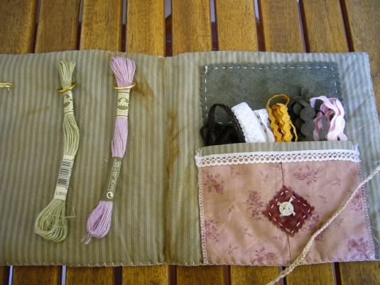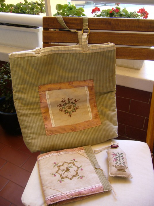 Si la decoración del paquete me ha dejado con la boca abierta, imaginaros la cara que he puesto cuando lo he abierto. ¡¡Que cosas tan bonitas me ha enviado!! Lo primero que he visto ha sido una bolsa para las labores ¡preciosa! y en su interior  un acerico y un costurero de viaje hechos a juego con las telas del bolso y todos decorados… ¡¡con esquemas de Niky!!