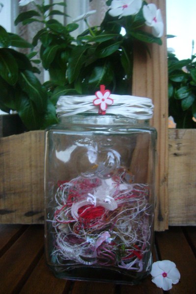 Os recuerdo que el objetivo de este SAL es ir guardando todos los restos de hilos y telas durante 1 año y después usarlos como relleno de algún alfilitero, biscornú, etc. y además It´s Daffycat realiza un sorteo entre todas las que publiquemos cada mes una foto de nuestro tarro el dia de luna nueva .