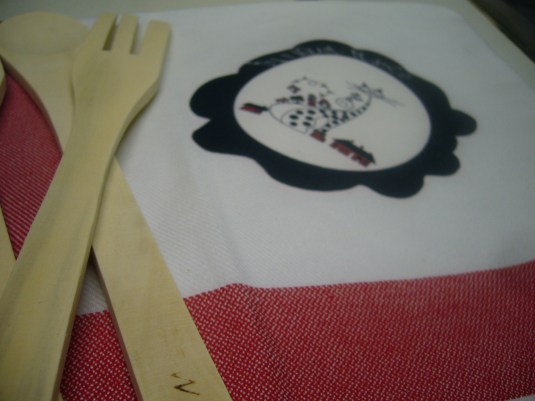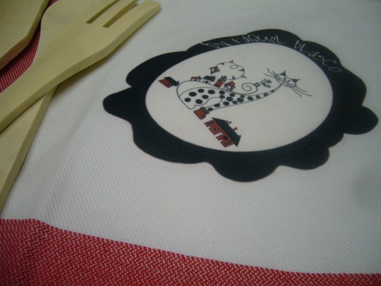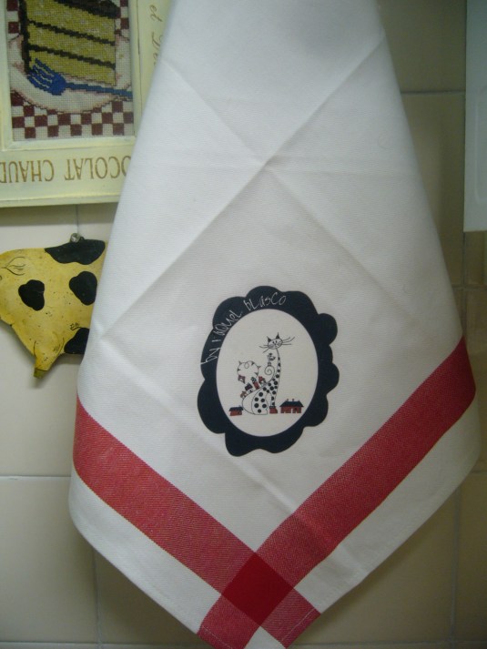 Raquel estampó el dibujo en un paño de cocina y para colgarlo le añadío una cinta de cuadritos vichy de color rojo. Como comprenderéis este paño está prohibido tocarlo, sólo se puede mirar.