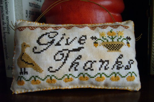 Para agradecerle la  invitación le  bordé un gráfico gratuito de Heartstring samplery que teñí con te Rooibos para darle un sutil color anaranjado.