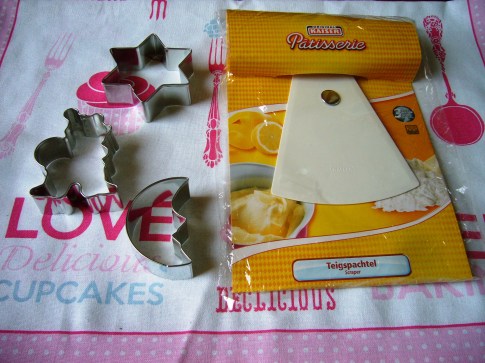 …un paño de cocina , una espátula y unos moldes para galletas.