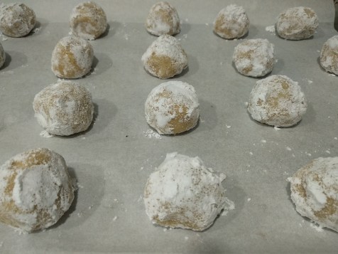 Hacer bolitas de masa y rebozarlas primero en azúcar lustre y luego en azúcar glass. Colócalas sobre la bandeja. .