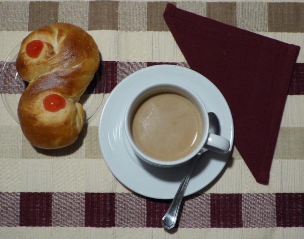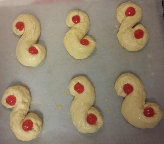 Desgasificar y formar los bollos; les damos forma de S y en cada unión ponemos un fruto rojo desecado, pincelar con el otro huevo, levar de nuevo y al horno a 180 grados con calor arriba y unos 30 min. o hasta que se hayan dorado.