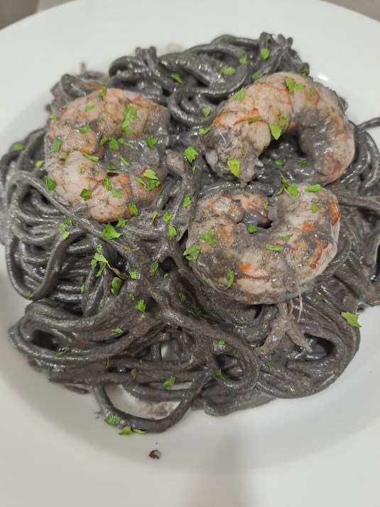 Para esta receta os recomiendo usar espaguetis negros o spaguettis al nero di sepia, pero si no los encontráis podéis utilizar los normales añadiendo al cocerlos una o dos bolsitas de tinta de calamar y os quedarán más o menos oscuros.