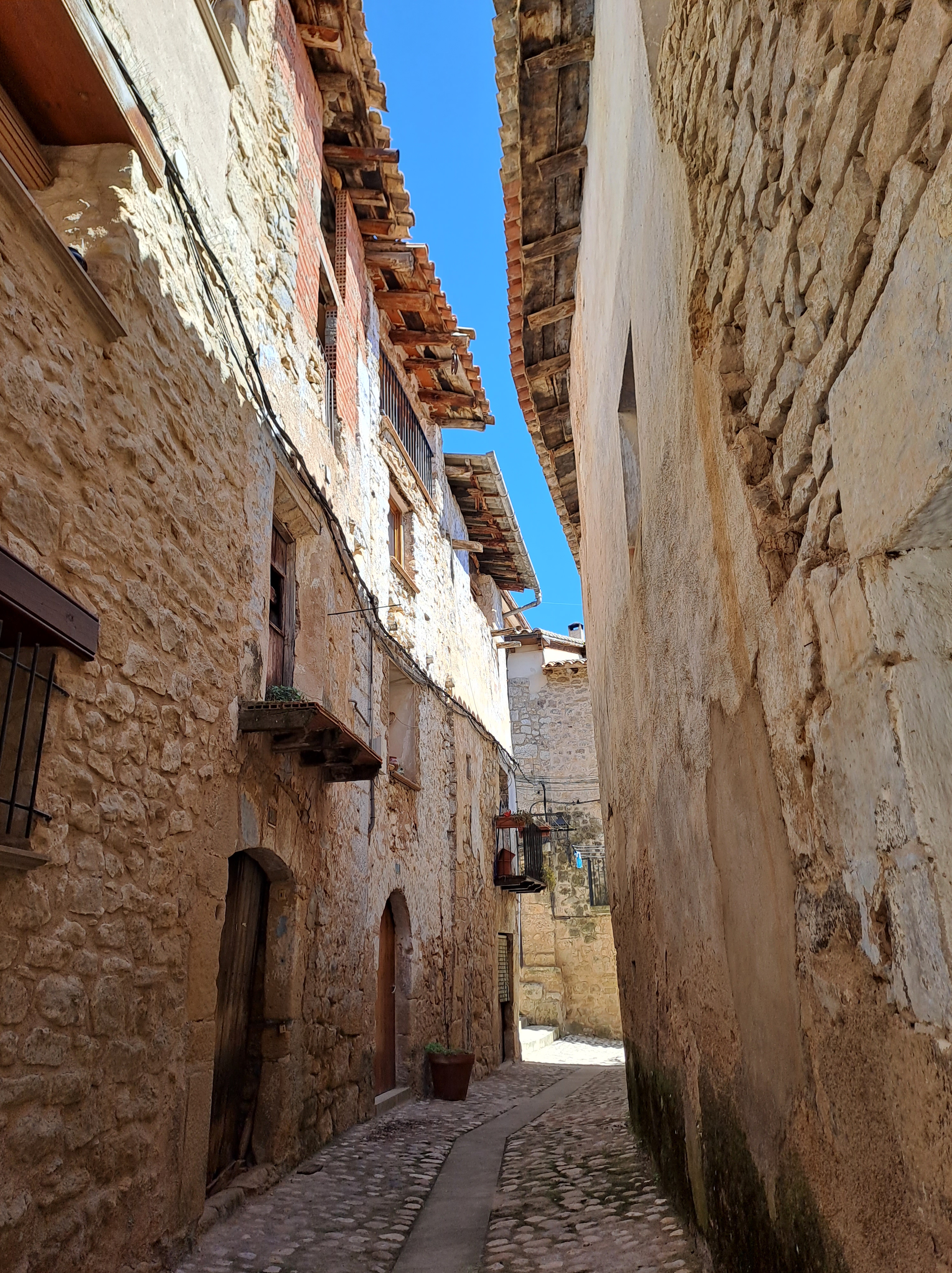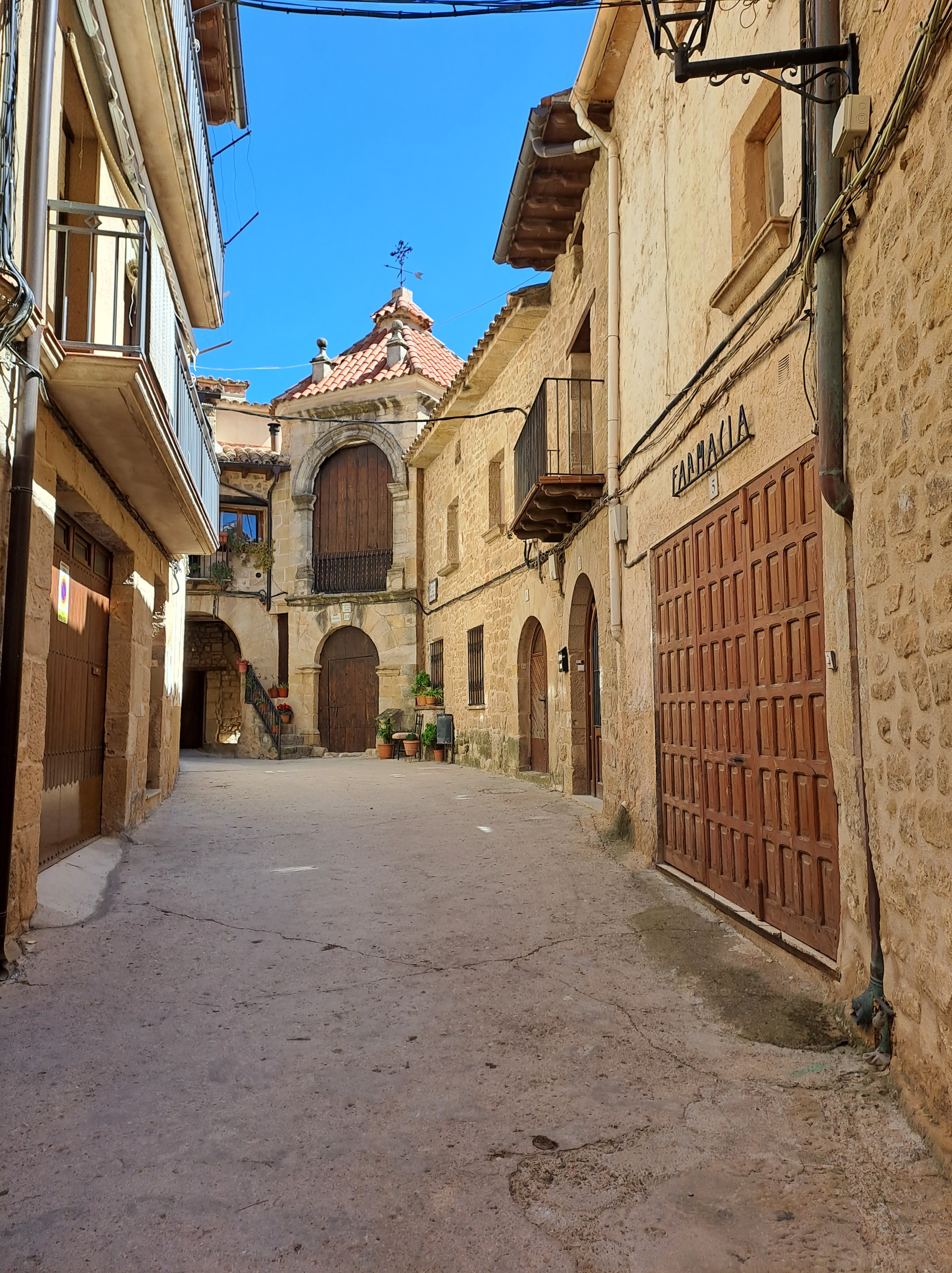 Y La Fresneda, un pueblo de película. Las edificaciones, en piedra la mayoría y encaladas en azulete otras, están llenas de detalles que no se pueden dejar de ver. A destacar el barrio de la judería, sucesión de callejuelas perpendiculares a la Calle Mayor.