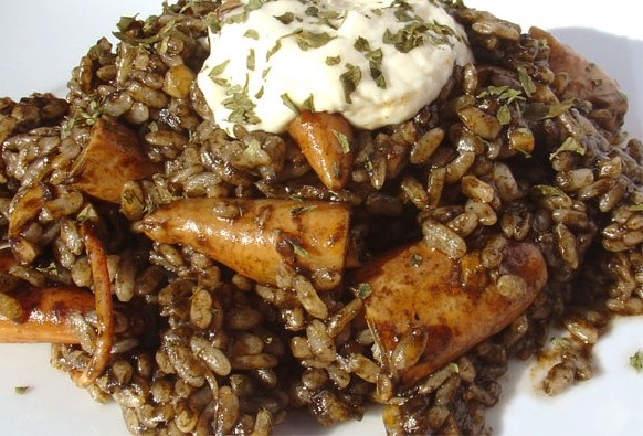 Hacemos el sofrito de base con la cebolla, los pimientos y el ajo. A medio sofreír se añaden las tiras de secreto y se rehogan bien. Luego añadimos el tomate y dejamos rehogar unos minutos más. Añadimos el pimentón . Cuando esté hecho el sofrito añadimos el arroz y lo rehogamos bien. Por último añadimos las alcachofas y el caldo que tendremos caliente.