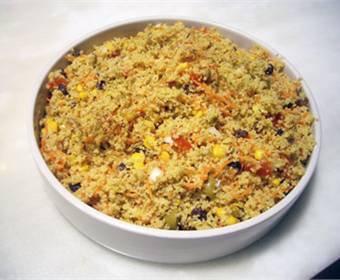 Hidratar el cuscús: tomar como medida 4 tazas de cous-cous por 4 tazas de caldo de verduras bien caliente; mezclar y dejar reposar 5-6 minutos tapado.