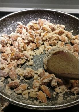 Sin dejar de remover, veremos que el caramelo se queda sin líquido y se pone seco, como una arenilla. Cuando tenemos el azúcar así subimos un poco el fuego para lograr que las almendras se vayan caramelizando sin pegarse unas a otras. Seguimos removiendo para que el caramelo se distribuya de manera homogénea sobre las almendras.