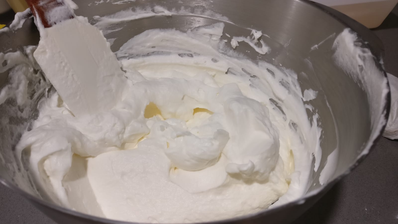 Mientras tanto montamos las claras con la mitad del azúcar por un lado y por otro lado montamos la nata con el resto del azúcar. Incorporamos ambas mezclas con movimientos envolventes para que se bajen lo menos posible.