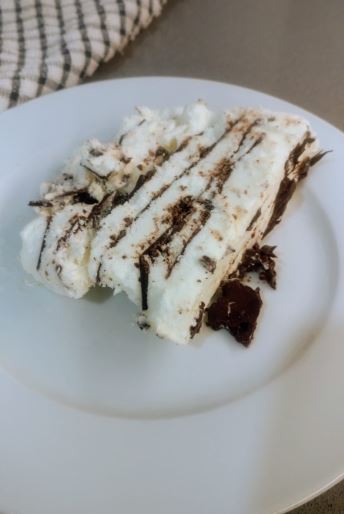 Para montar la tarta, en un molde alargado ponemos una primera capa de helado de nata, después añadimos una lámina de chocolate, y continuamos poniendo capas de helado y láminas de chocolate, hasta terminar con el helado. Cubrimos con papel film para que el helado con coja aire que pueda formar hielo y también evita que absorba olores.