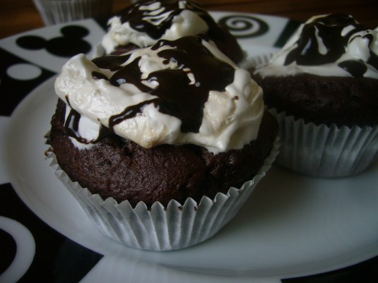 Retiramos del horno, dejamos templar durante 10 minutos y ponemos unos chips en la superficie de cada muffin para decorar. Con el calor se fundirán un poco, pero mantendrán su forma.
